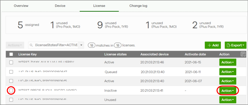 An administrator account should have read and write (Full) access privilege to un-assign licenses. Only an Inactive license (the license is assigned to a specific Nebula Device but not activated) can be un-assigned.