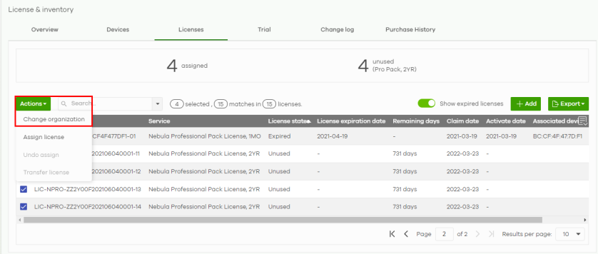2 With the licenses you want to transfer selected, click Actions and then click Change organization.