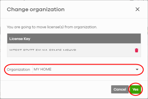 3 Select the Organization you want to transfer the licenses to. The current organization will be excluded from the list. Then click Yes.