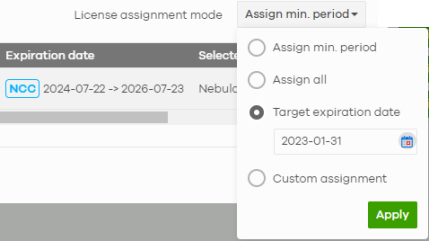 • Target expiration date – all licenses that meet the expiry criteria you set and can be assigned are displayed.