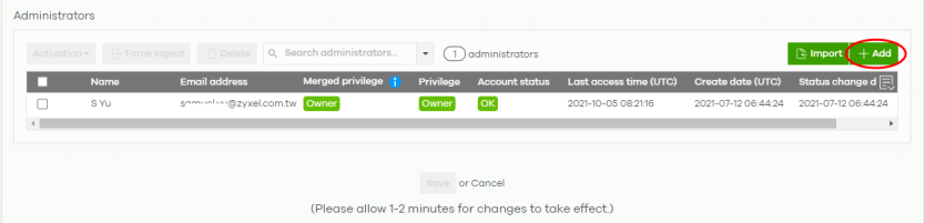 1 Go to the Organization-wide > Administrators screen. Click +Add.