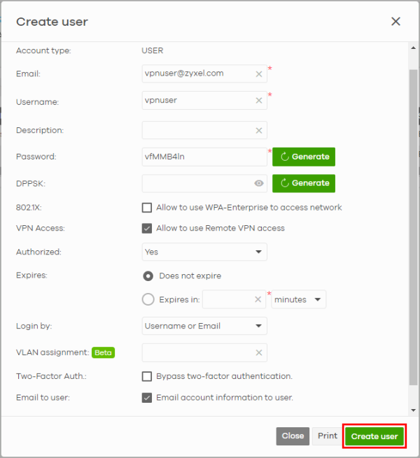 2 Enter an Email, Username, generate or enter a Password (4 to 31 characters, including 0–9 a–z A–Z `~!@#$%&*(_+-={}|[];'"./<> ?). Click Allow to use Remote VPN access. Click Does not expire to set no time limit for this user account. Select Username or Email in Login by. Click to select Email account information to user. Then click Create user.