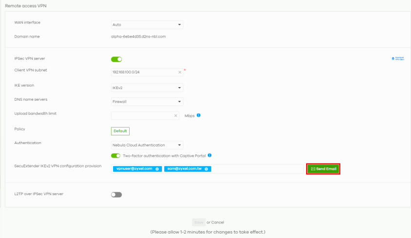 2 Click Send Email to give your VPN client the configuration instructions through email.