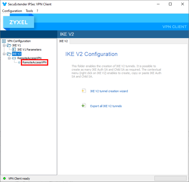 1 Right-click RemoteAccessVPN in VPN Configuration > IKE V2 > RemoteAccessVPN and click Open tunnel.
