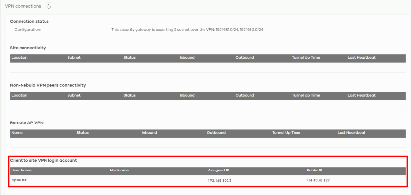 Go to the Site-wide > Monitor > Firewall > VPN connections screen. The remote VPN connection should appear in Client to site VPN login account table.
