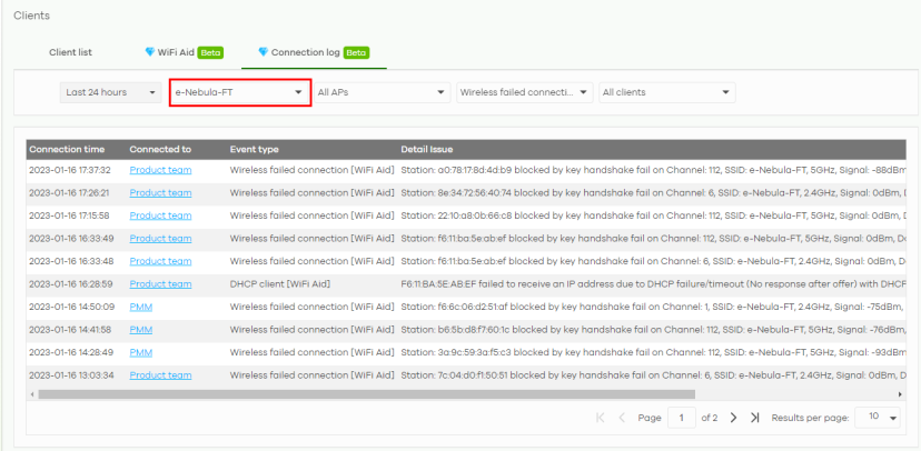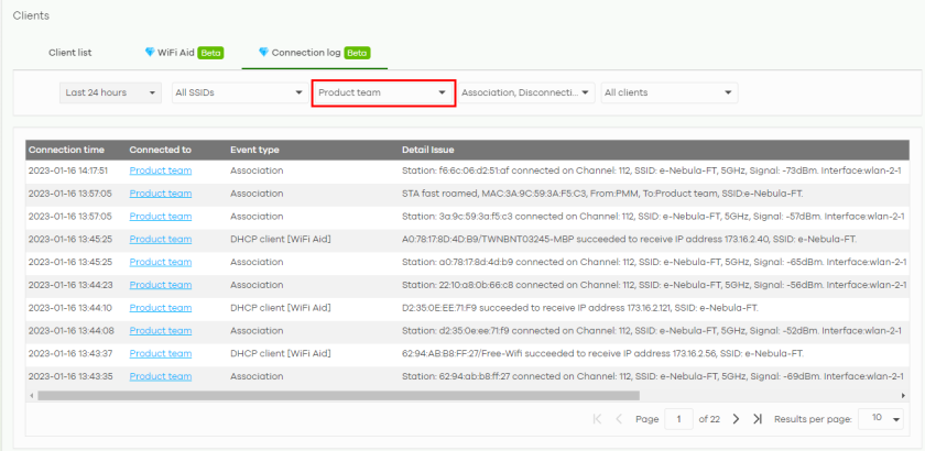 Connection log screen appears showing all related event logs between a specific AP (for example, Product team) and its WiFi clients. See