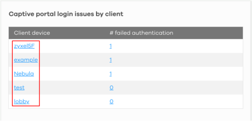 This table displays the list of WiFi clients with the corresponding number of failed connection to the Nebula Device acting as a hotspot. The list displays the WiFi client that could not connect to the Nebula Device acting as a hotspot the most number of times first, in descending order.