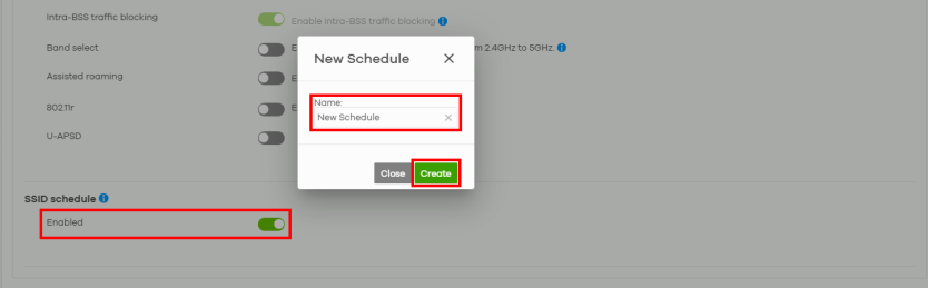 1 Go to Site-wide > Configure > Access points > SSID advanced settings. Click the Enabled switch in SSID schedule to the right to configure a schedule. The New Schedule window appears. Enter a descriptive Name for the schedule of up to 127 characters (0 to 9 a to z). The casing does not matter. Then, click Create.