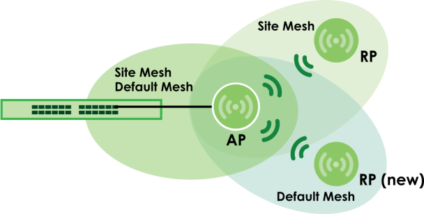 • Repeater AP (RP): A Nebula Device (mesh extender) that is connected to the network wirelessly, or that is connected to the network by Ethernet but cannot reach the gateway device.
