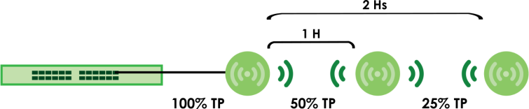 Nebula Smart Mesh supports an unlimited number of hops. However, each hop in a mesh network reduces network throughput by up to half. Therefore, we recommend only allowing a maximum of two hops within your Smart Mesh network.
