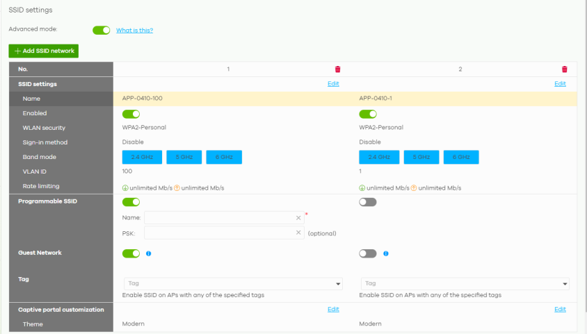 Advanced mode | Select Off to disable Advanced mode. This allows you to create SSID profiles by only specifying an SSID name and optional password. NCC sets all other WiFi settings to default. |