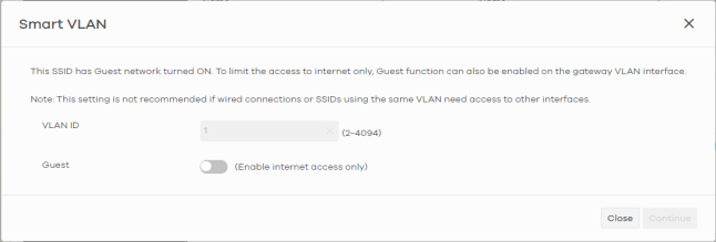 Guest Network | Select On to set this WiFi network as a guest network. Layer 2 isolation and intra-BSS blocking are automatically enabled on the SSID. WiFi clients connecting to this SSID can access the Internet through the Nebula Device but cannot directly connect to the LAN or the WiFi clients in the same SSID or any other SSIDs. ![]() |