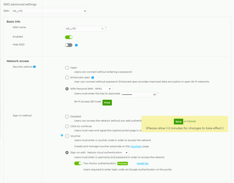 Security options | Select Open to allow any client to associate this network without any data encryption or authentication. Select Enhanced-open to allow any client to associate this network without any password but with improved data encryption. Select WPA Personal With (WPA2/WPA3) and enter a pre-shared key from 8 to 63 case-sensitive keyboard characters to enable WPA2/3-PSK data encryption. After selecting WPA Personal With WPA3, Nebula Devices that do not support it will revert to WPA2. • Turn on Transition mode to generate two VAPs (virtual APs) so devices that do not support Enhanced-open / WPA Personal With WPA3 can connect using Open / WPA Personal With WPA2 network. Click Print to display the Wi-Fi Access QR Code that includes the password for quick access. You can save the QR code as PDF. To test, use a smartphone to scan the QR code. Click to join the network. The client device should connect to WiFi directly without asking the password. Select Dynamic personal psk with to have every user connect to the SSID using a unique pre-shared key (PSK) that is linked to their user account; together with My RADIUS server to use an external RADIUS server. Or select Nebula cloud authentication to use the NCC for MAC authentication. This allows you to revoke a user’s WiFi network access by disabling their account. Enter an optional backup key in Users can enter this backup key to associate for clients who forget their DPPSK but still want to connect to the SSID. After enabling this option, you must create one or more DPPSK users in the site or organization at Site-wide > Configure > Cloud authentication > Account Type > DPPSK. • For details on creating a site DPPSK user, see Cloud Authentication DPPSK Screen. • For details on creating organization DPPSK users, see Create/Update User Account. Turn on MAC-based Authentication with to authenticate WiFi clients by their MAC addresses together with My RADIUS server to use an external RADIUS server. Or select Nebula cloud authentication to use the NCC for MAC authentication. Select WPA-Enterprise with to enable 802.1X secure authentication. You can select My RADIUS server to use an external RADIUS server or select Nebula cloud authentication to use the NCC for 802.1X authentication. • Select Two-Factor Authentication to require that the user log in using both their password and a Google Authenticator code. To log in, users must have Two-Factor Authentication enabled on their account and have setup Google Authenticator on their mobile device. Select Enable on RAP only to only require Two-Factor Authentication when accessing the network through a remote access point (RAP). |