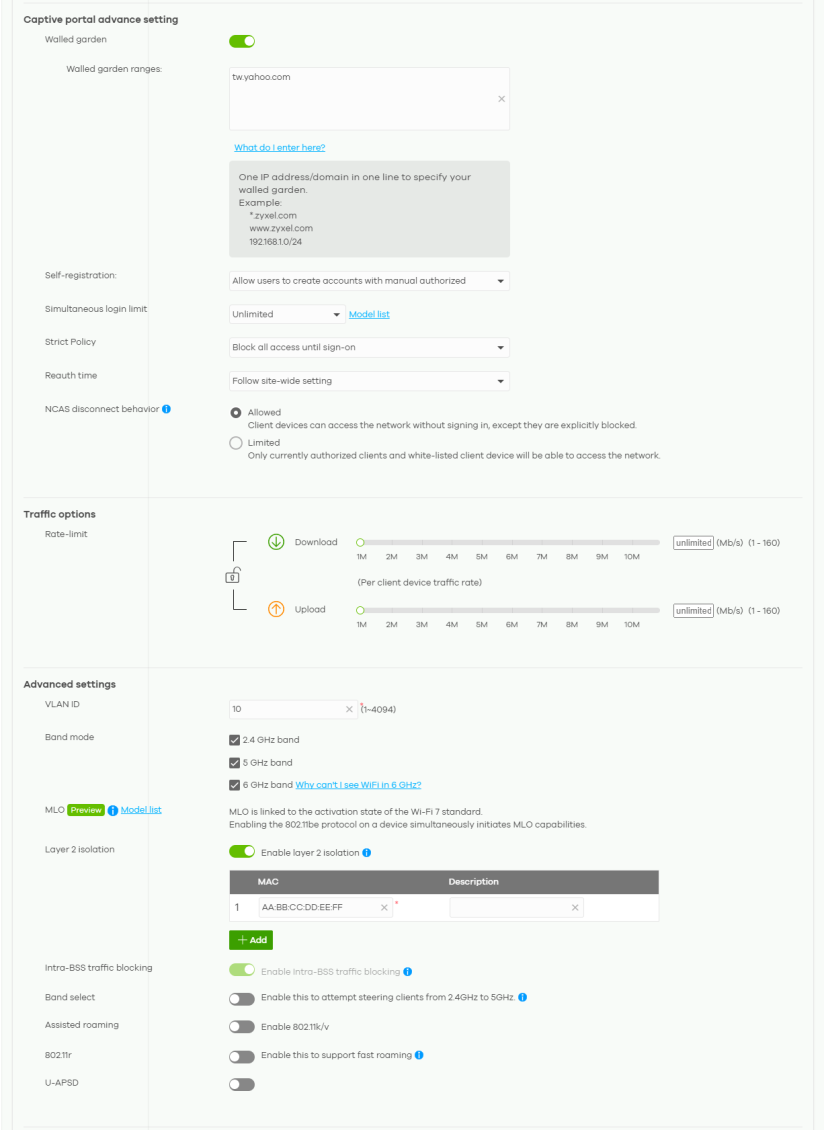 Walled garden ranges | This field is not configurable if you set Sign-in method to Disable. With a walled garden, you can define one or more web site addresses that all users can access without logging in. These can be used for advertisements for example. Select to turn on or off the walled garden feature. Specify walled garden web site links, which use a (wildcard) domain name or an IP address for web sites that all users are allowed to access without logging in. |