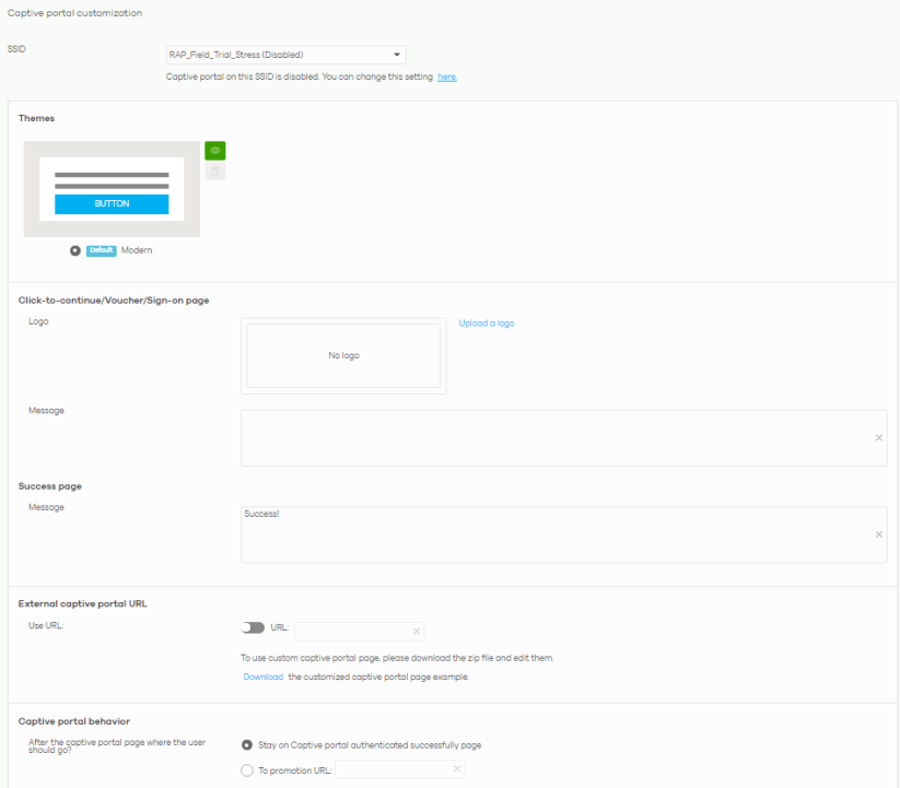 Click-to-continue/Voucher/Sign-on page This section is not configurable when External captive portal URL is set to ON. | |