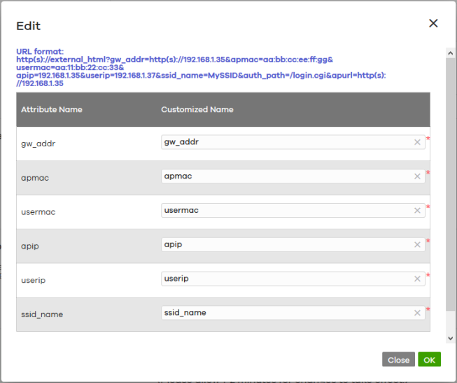Use URL | Select On to use a custom login page from an external web portal instead of the one built into the NCC. You can configure the look and feel of the web portal page. Specify the login page’s URL; for example, http://IIS server IP Address/login.asp. The Internet Information Server (IIS) is the web server on which the web portal files are installed. Click Download to download a ZIP file containing example captive port files. Edit these files then upload them to a webserver which is accessible from NCC. ![]() |