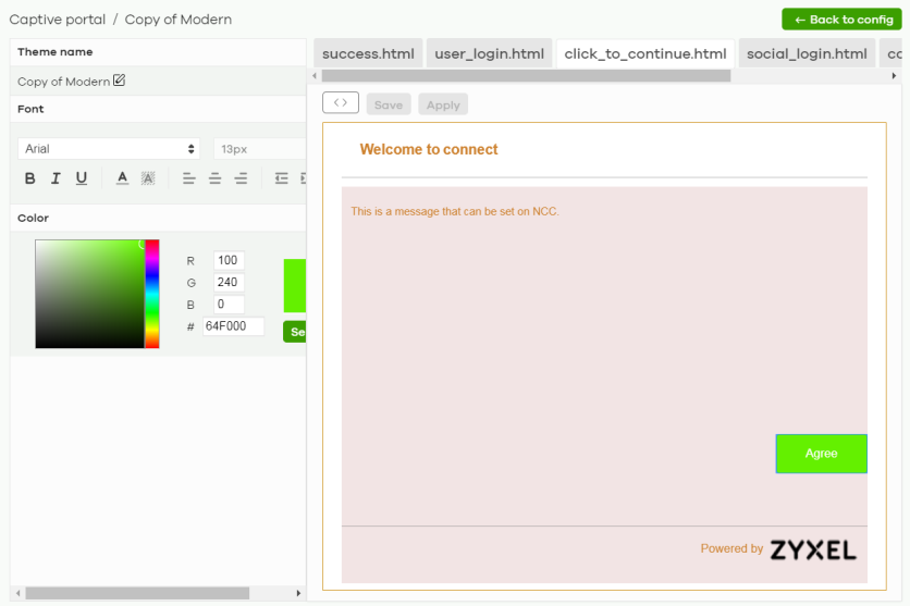 Apply | Click this button to save your settings for the selected HTML file to the NCC and apply them to the access points in the site. |