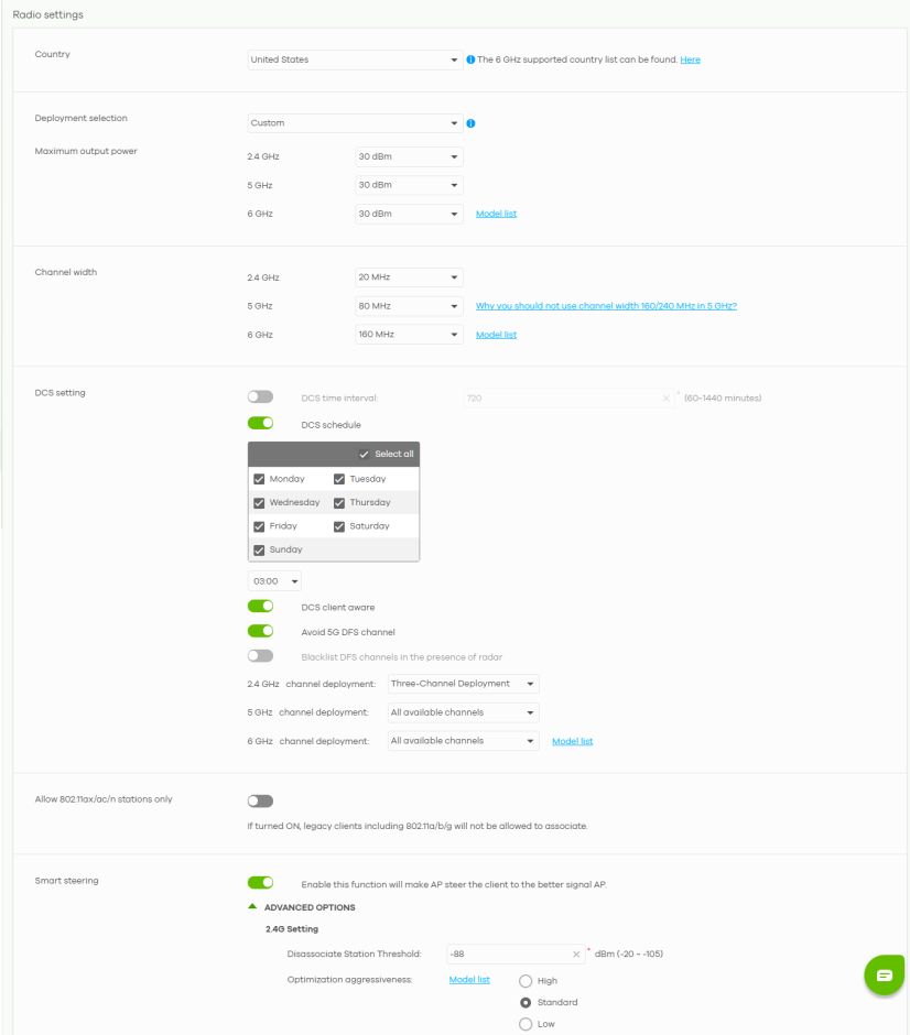 Maximum output power | Selecting any of the options in the Deployment selection field will automatically set the maximum output power for 2.4 / 5 / 6 GHz. But you can change the setting (1 to 30 dBm). |
