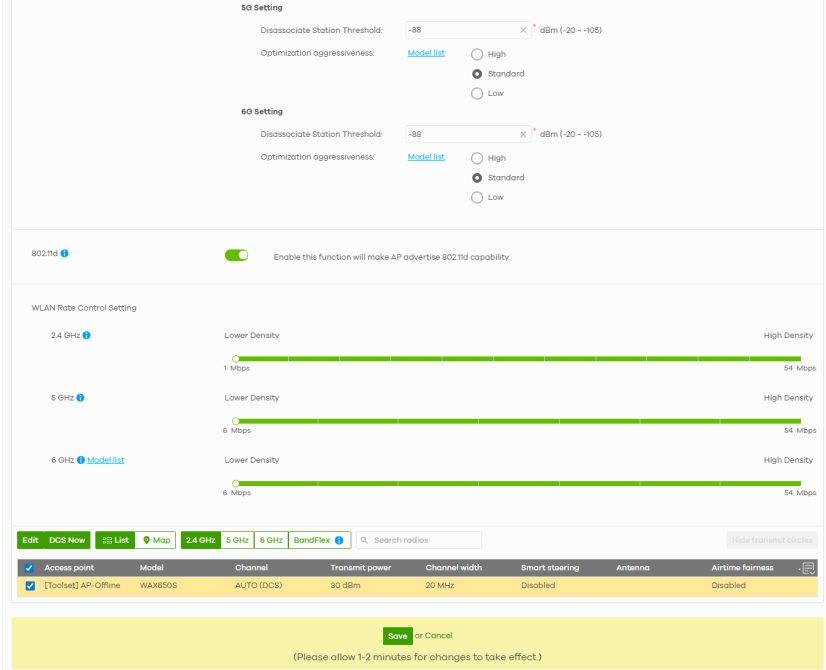 2.4 GHz / 5 GHz /6 GHz | Sets the minimum data rate that 2.4 GHz, 5 GHz, and 6 GHz WiFi clients can connect to the Nebula Device, in Mbps. Increasing the minimum data rate can reduce network overhead and improve WiFi network performance in high density environments. However, WiFi clients that do not support the minimum data rate will not be able to connect to the Nebula Device. |