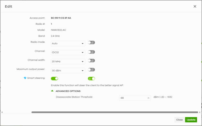 Smart Steering | Select ON to enable smart client steering on the Nebula Device. Client steering helps monitor WiFi clients and drop their connections to optimize the bandwidth when the clients are idle or have a low signal. When a WiFi client is dropped they have the opportunity to steer to an Nebula Device with a strong signal. Additionally, dual band WiFi clients can also steer from one band to another. Select OFF to disable this feature on the Nebula Device. |