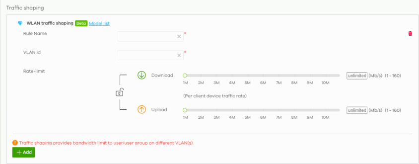 Rate-limit | Set the maximum data download and upload rates in Kbps, on a per-station basis. Click a lock icon to change the lock state. If the lock icon is locked, the limit you set applies to both download and upload traffic. If the lock is unlocked, you can set download and upload traffic to have different transmission speeds. |
