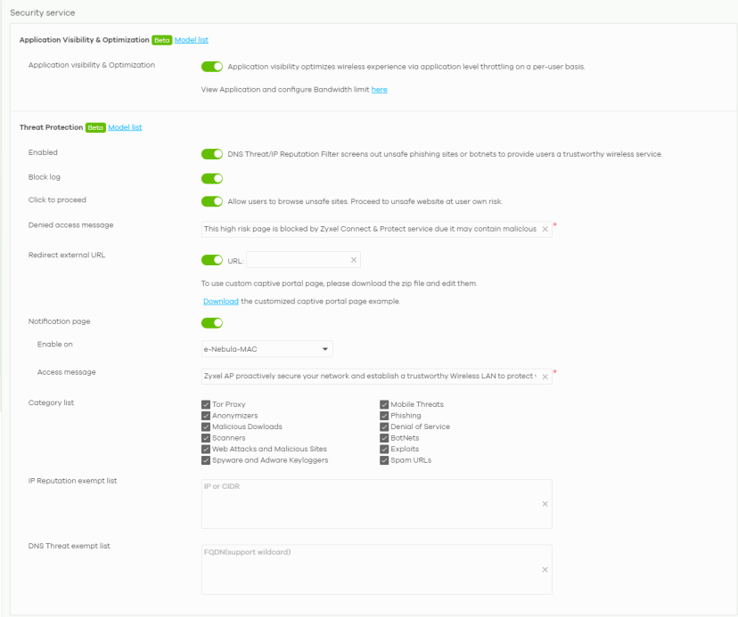 Enabled | Select this option to allow inspection of DNS queries made by clients on your network and turn on IP blocking on the Nebula Device. When you enable the DNS threat service, your Nebula Device inspects the DNS queries against a database of blocked or allowed Fully Qualified Domain Names (FQDNs). You can have the Nebula Device reply to the user with a fake DNS response (where the user will see a “Web Page Blocked!” page). When you enable the IP reputation service, your Nebula Device downloads signature files that identifies reputation of IPv4 addresses. You can have the Nebula Device forward, block, and/or log packets from IPv4 addresses based on these signatures and categories. |
