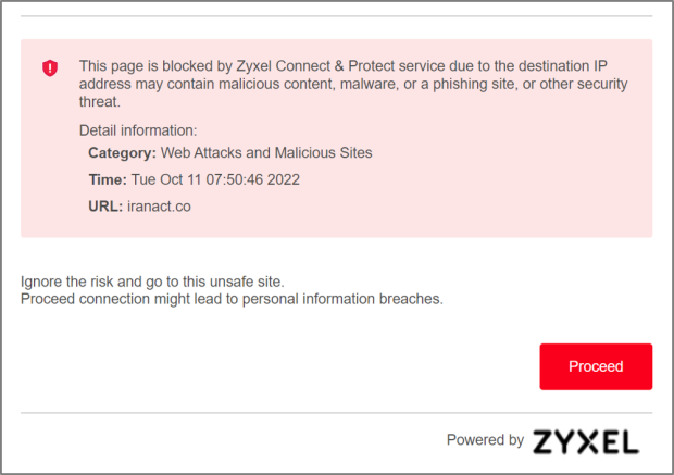 Click to proceed | Select this option to allow clients to browse unsafe websites. When enabled, the denied access message window includes the Proceed button. To continue, you must close and restart your web browser to visit the unsafe website. ![]() |