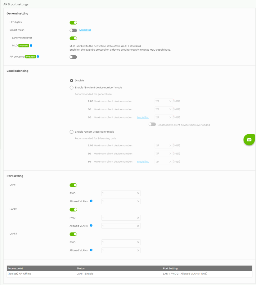 Enable "Smart Classroom" mode | Select this option to balance network traffic based on the number of specified client devices connected to the Nebula Device. The Nebula Device ignores association request and authentication request packets from any new client device when the maximum number of client devices is reached. The Disassociate client device when overloaded function is enabled by default and the disassociation priority is always Signal Strength when you select this option. |