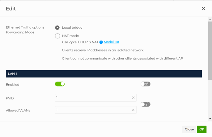 LAN x | This is the name of the physical Ethernet port on the Nebula Device. This section lets you configure global port VLAN settings for all Nebula Devices in the site. To modify port settings for a specific Nebula Device, use its Edit button in the table below. |