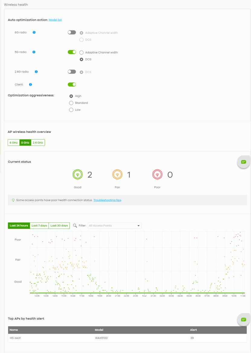 Current status | This shows the number of supported Nebula Devices that are currently online, using the specified frequency band that are in Good, Fair or Poor wireless health threshold as detected by Nebula. |