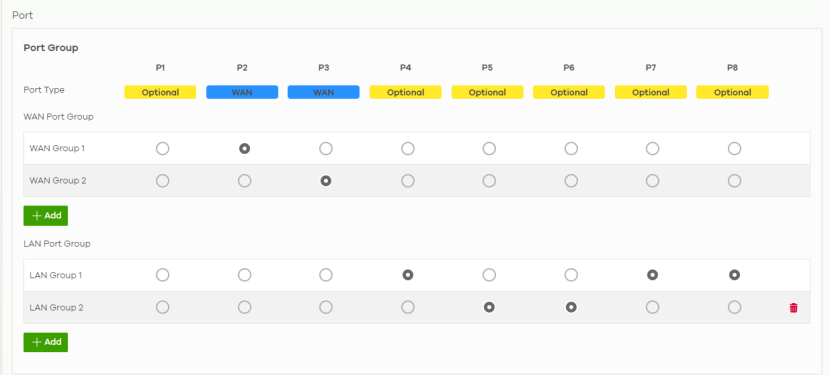 Port Group | Port groups create a hardware connection between physical ports at the layer-2 (data link, MAC address) level. The physical LAN Ethernet ports, for example P1, P2, P3, are shown at the top of the screen. The port groups are shown at the left of the screen. Use the radio buttons to select which ports are in each port group. For example, to add port P3 to LAN Group 1, select P3’s radio button in the LAN Group 1 row. |