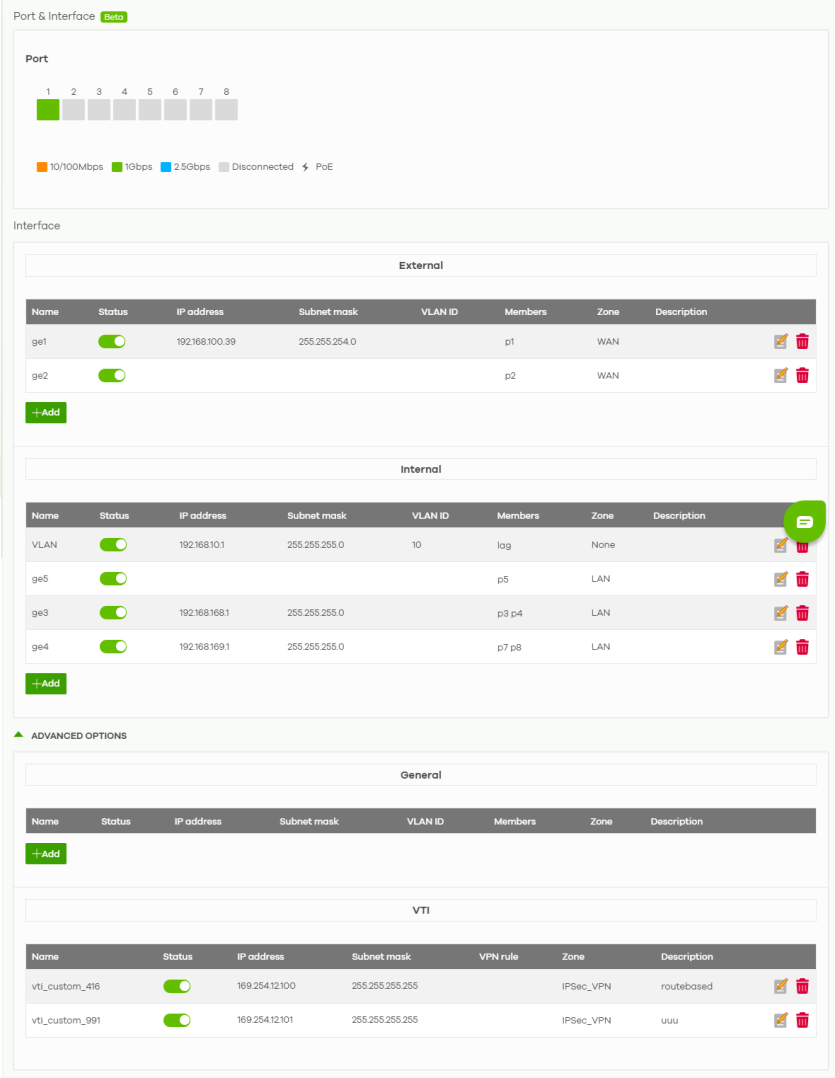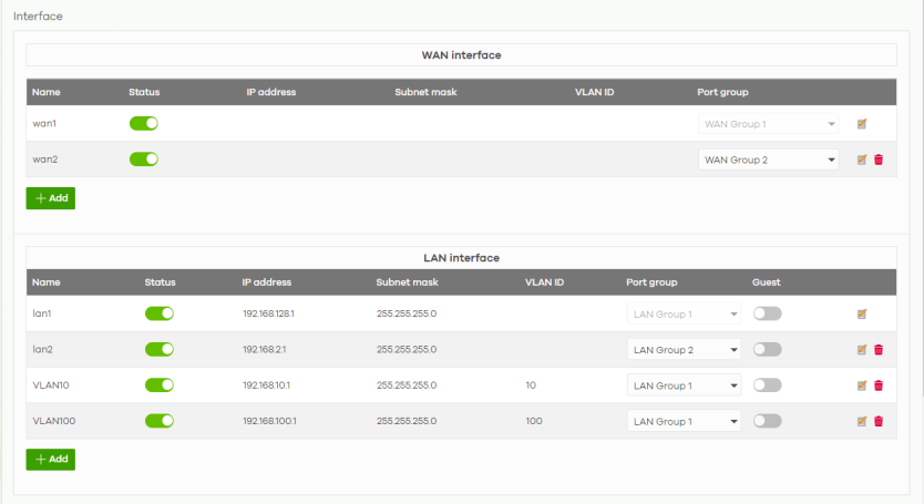 Add | Click this button to create a virtual LAN interface, which associates a VLAN with a LAN port group. |
