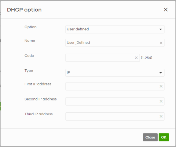 Type | This is the type of the selected DHCP option. If you selected User defined in the Option field, select an appropriate type for the value that you will enter in the next field. Misconfiguration could result in interface lockout. |