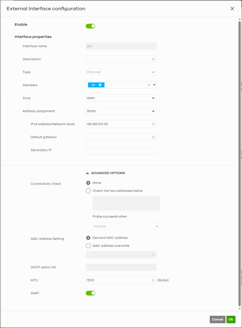 SNAT | Select this to enable SNAT. When enabled, the Nebula Device rewrites the source address of packets being sent from this interface to the interface's IP address. |