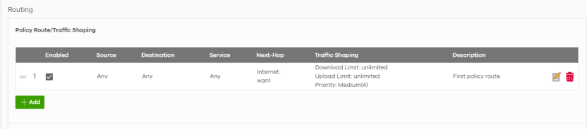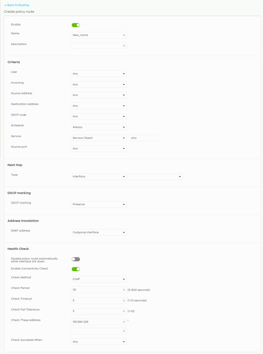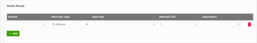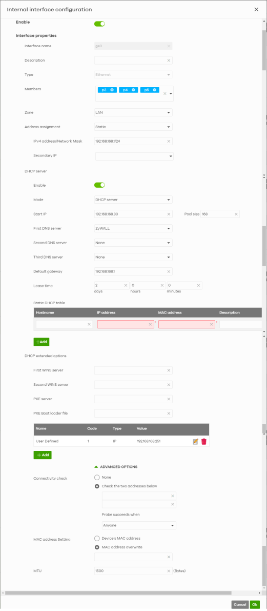 Default gateway | If you set this interface to DHCP server, you can select to use either the interface’s IP address or another IP address as the default router. This default router will become the DHCP clients’ default gateway. |