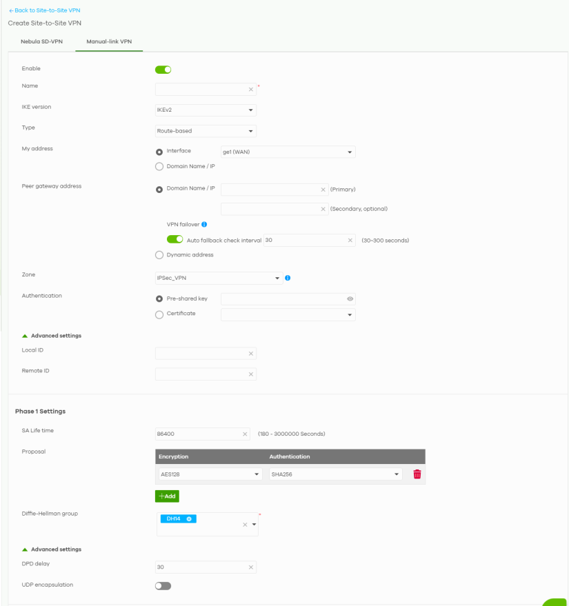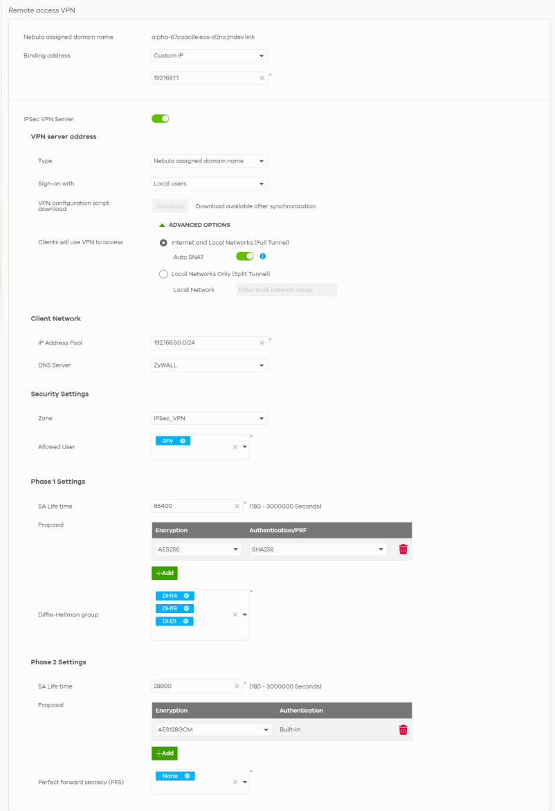 Interface | The interface is fixed at Auto through which the Nebula Device sends DNS queries to the specified DNS server. Alternatively, the drop-down menu will show all External/Internal/General and VTI interface names. |