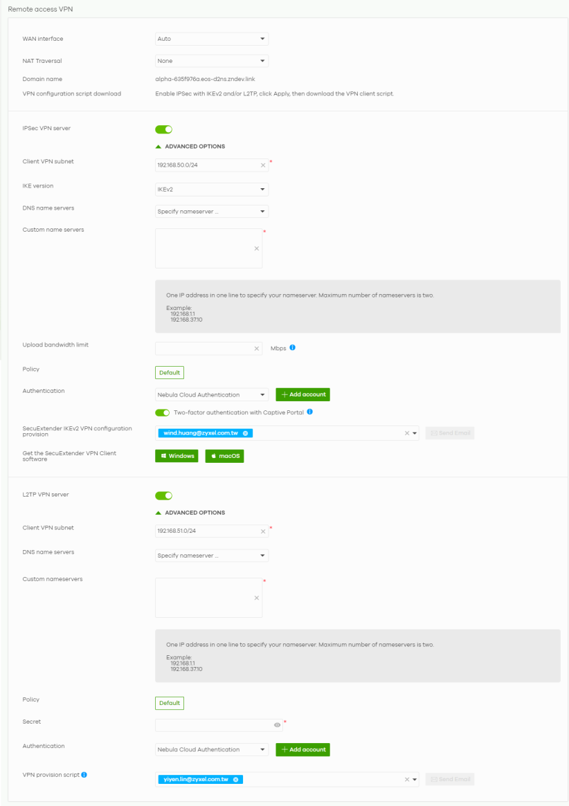 Domain Zone Forwarder | This specifies a DNS server’s IPv4 address. The Nebula Device can query the DNS server to resolve domain zones for features like VPN, DDNS and the time server. When the Nebula Device needs to resolve a domain zone, it checks it against the domain zone forwarder entries in the order that they appear in this list. |