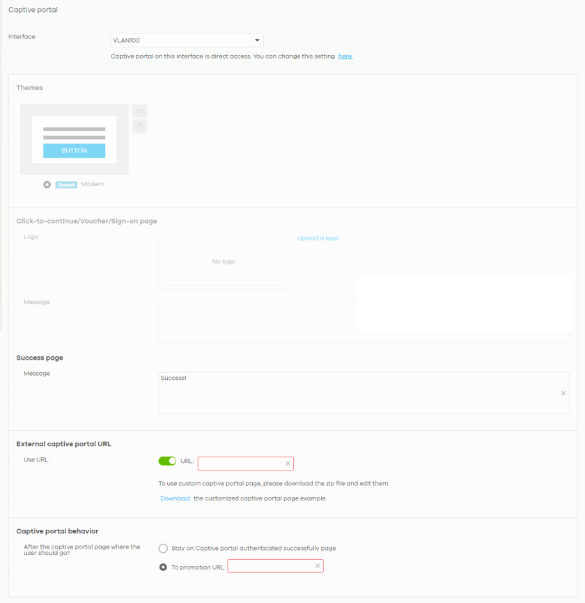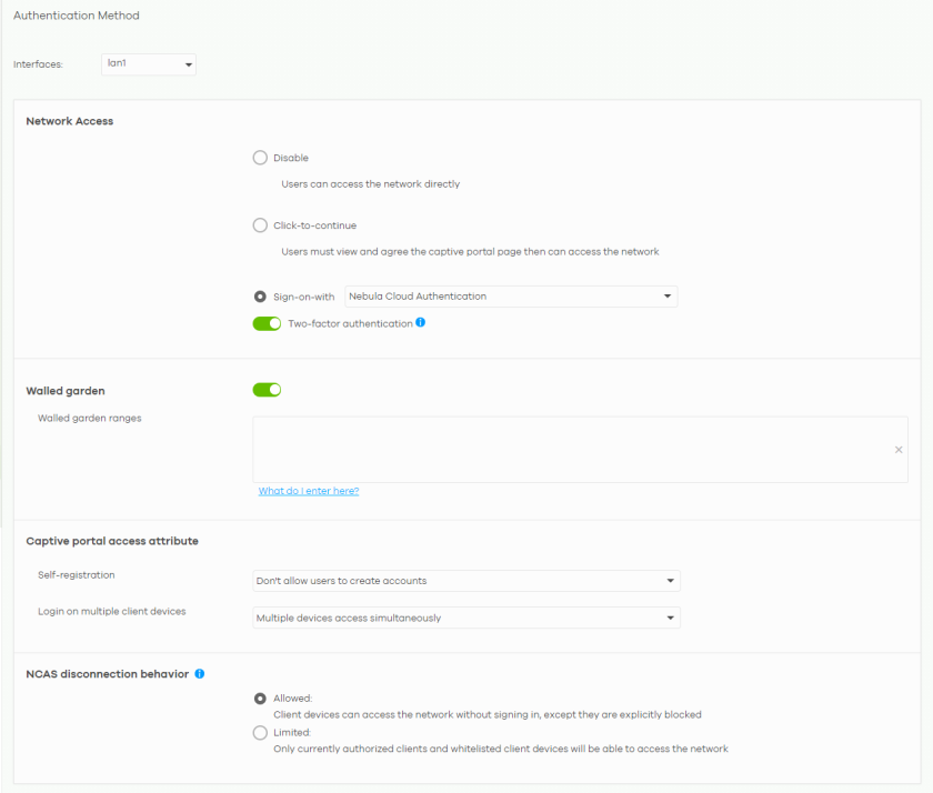 Global walled garden | With a walled garden, you can define one or more web site addresses that all users can access without logging in. These can be used for advertisements for example. Specify walled garden web site links, which use a domain name or an IP address for web sites that all users are allowed to access without logging in. |