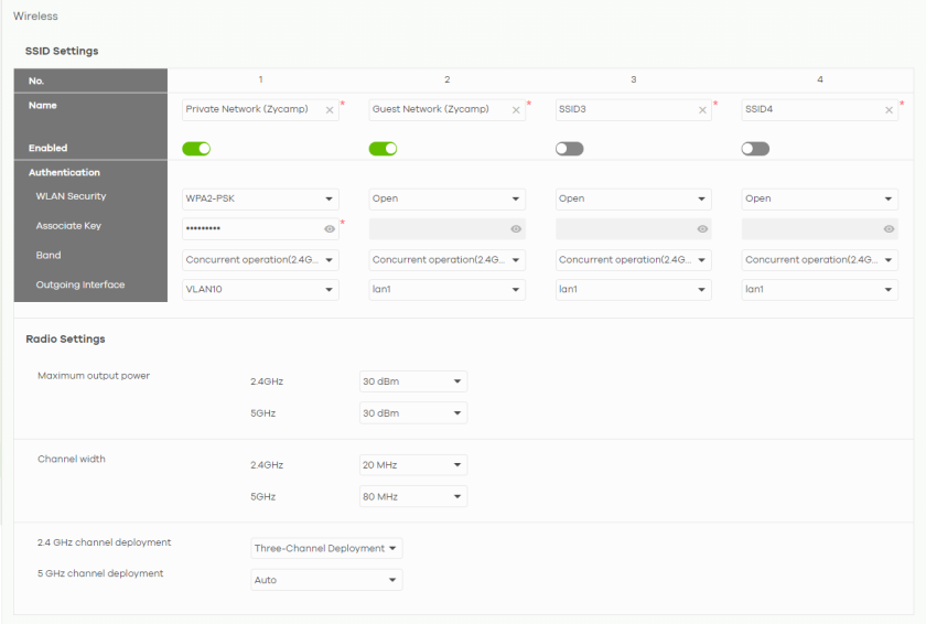 2.4 GHz channel deployment | Select Three-Channel Deployment to limit channel switching to channels 1, 6, and 11, the three channels that are sufficiently attenuated to have almost no impact on one another. In other words, this allows you to minimize channel interference by limiting channel-hopping to these three “safe” channels. Select Four-Channel Deployment to limit channel switching to four channels. Depending on the country domain, if the only allowable channels are 1 to 11 then the Nebula Device uses channels 1, 4, 7, 11 in this configuration; otherwise, the Nebula Device uses channels 1, 5, 9, 13 in this configuration. Four-Channel Deployment expands your pool of possible channels while keeping the channel interference to a minimum. Select Manual to choose the allowable channels 1 to 11. |