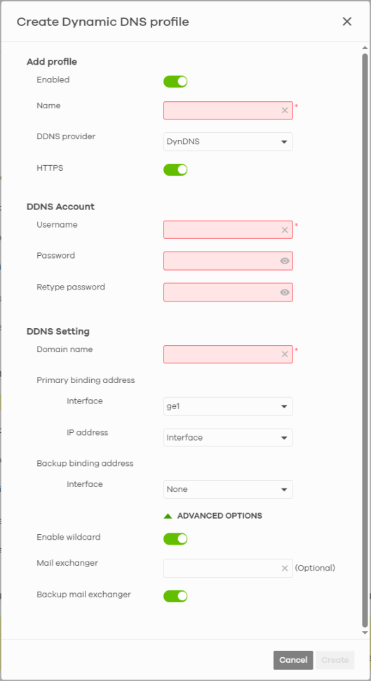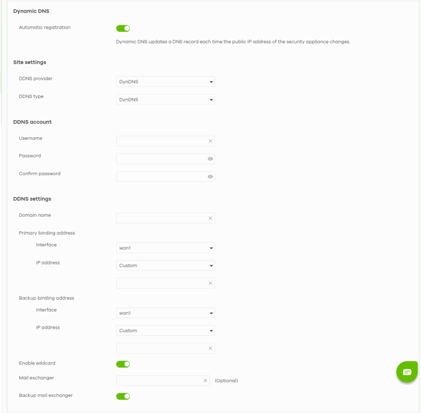 Backup binding address | Use these fields to set an alternate interface to map the domain name to when the interface specified by the Primary binding address settings is not available. |