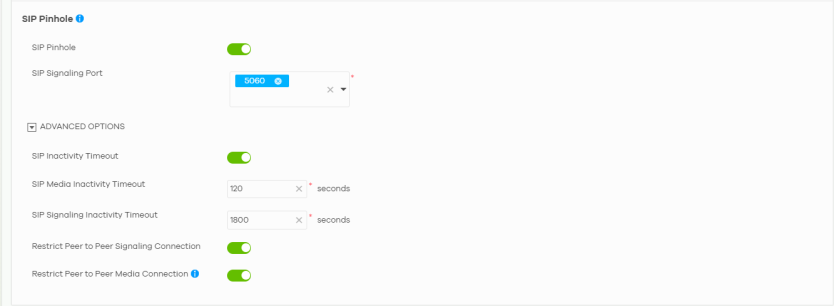 ADVANCED OPTIONS | Click the arrow to show the fields for setting the SIP inactivity timeout and restrict peer-to-peer connection. |