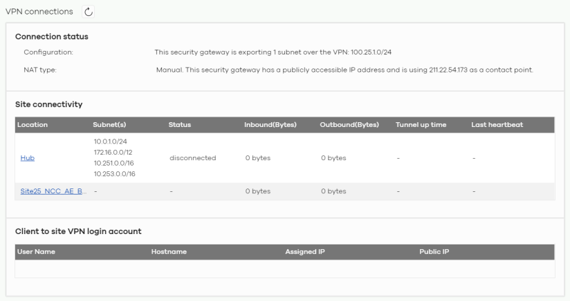 Location | This shows the name of the site to which the peer gateway is assigned. Click the name to go to the Site-wide > Configure > Security gateway > Site-to-Site VPN screen, where you can modify the VPN settings. |