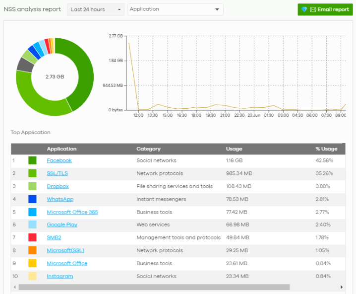 Security Appliance – NSS Analysis | Select to view the report for the past day, week or month. Alternatively, select Custom range... to specify a time period the report will span. You can also select the number of results you want to view in a table. ![]() |