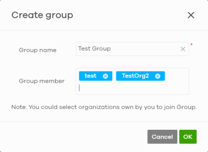 3 In the Create group window, enter a group name and then select two or more organizations to add to the group. You must be the group owner, and each group must have a Pro Pack license. Then click OK.
