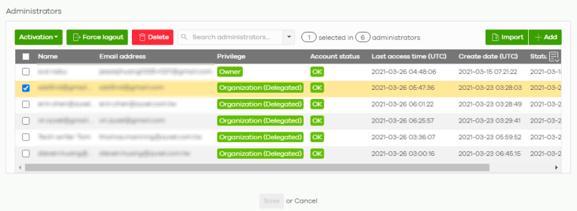 Import | Click this button to create administrator accounts in bulk by importing a complete list of all new administrators in an Excel file. ![]() |