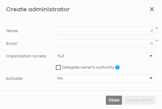 Delegate owner’s authority | This setting is only available when Organization access is set to Full. Select this setting to grant delegate owner privileges to an organization full administrator account. An account with delegate owner privileges can perform all of the same actions as the organization owner, except for the following: • Delete organization • Transfer organization ownership • Assign delegate owner privileges to an administrator account. |