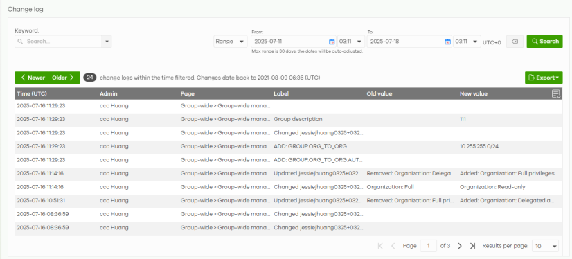 Range/Before | Select a filtering option, set a date, and then click Search to filter log entries by date. Range: Display log entries from the first specified date to the second specified date. Before: Display log entries from the beginning of the log to the selected date. |