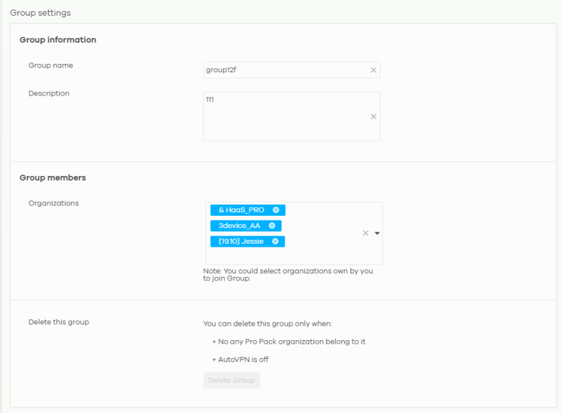 Delete this group | Click this to delete the group.  You can only delete a group if it contains no organizations, and Hub to Hub VPN is disabled at Group-wide > Group-wide manage > Org-to-Org VPN. |