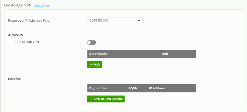 Reserved IP Address Pool | Specify the IP addresses that Nebula Devices use to create the VPN tunnels between the gateway devices in the org-to-org VPN network. You can select a set or custom range. This IP address range must not overlap with any IP address ranges already in use within any sites in the org-to-org VPN. |
