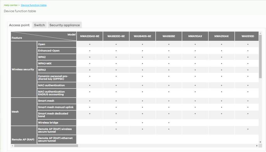Click Help > Support tools > Device function table to view a list of NCC-compatible Access Points, Switches, Security Gateway, and Security Firewall devices at the time of writing. The table also includes which features each Nebula Device supports.